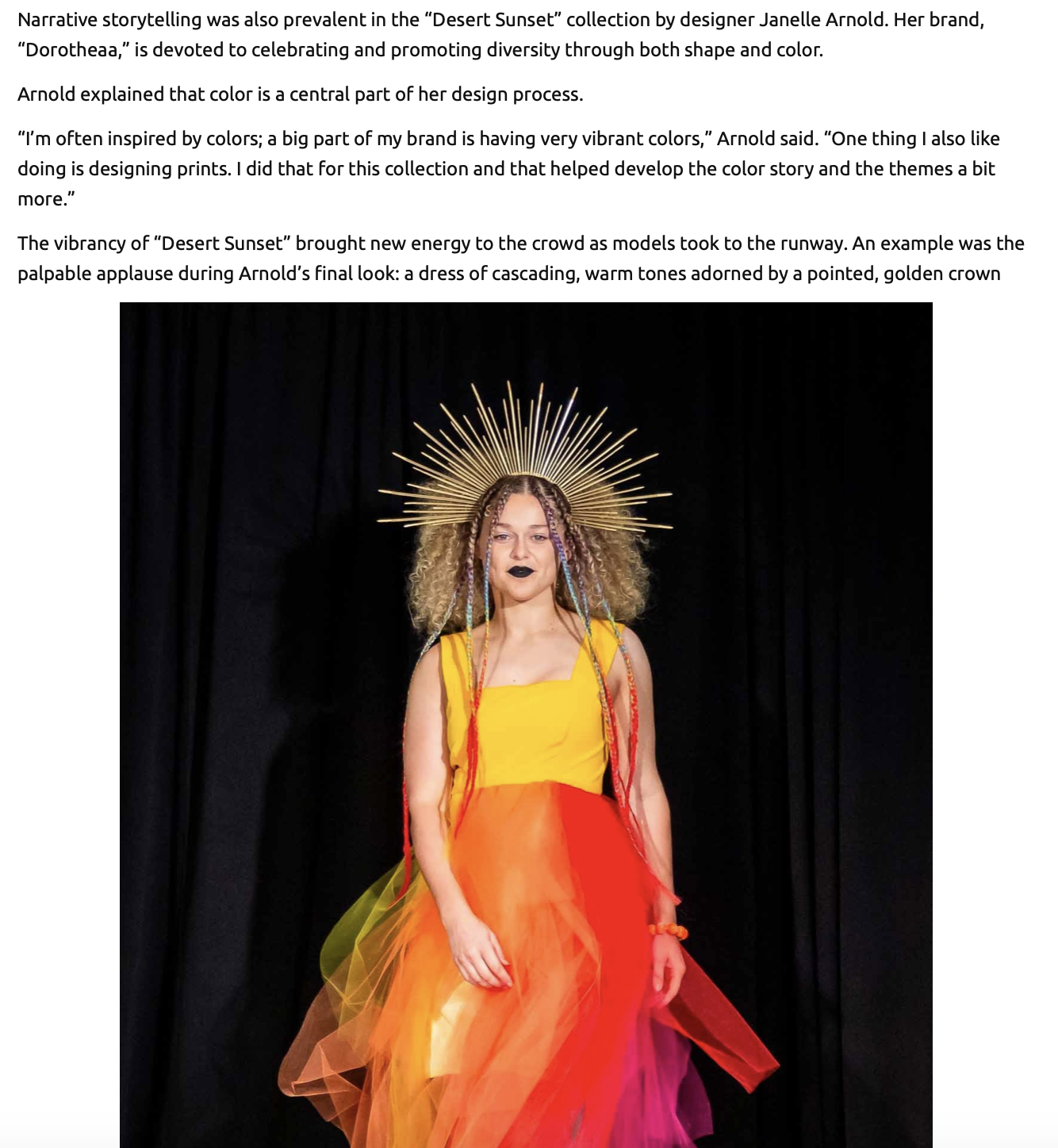 “Narrative storytelling was also prevalent in the “Desert Sunset” collection by designer Janelle Arnold. Her brand, “Dorotheaa,” is devoted to celebrating and promoting diversity through both shape and color.”